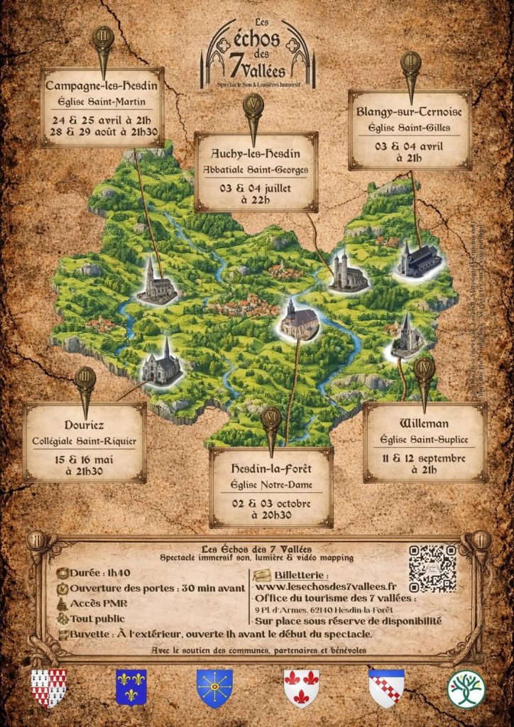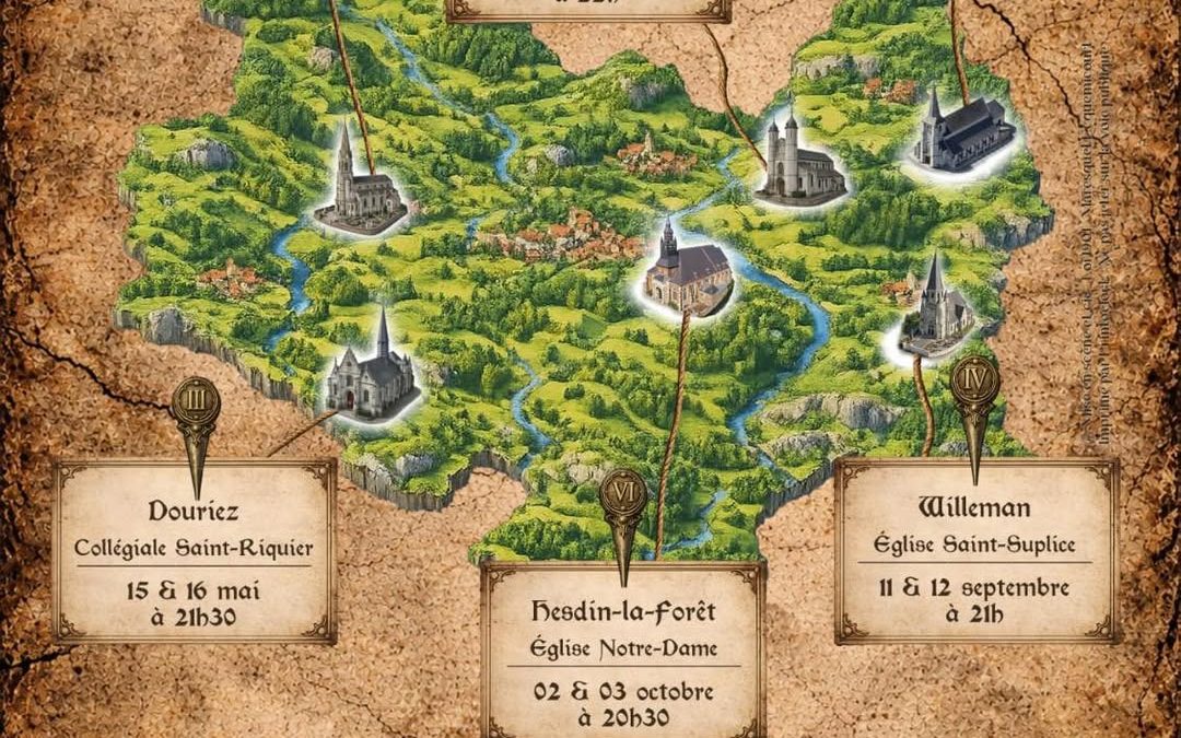 Spectacle sons et lumières immersif avec vidéomapping les 15 et 16 mai 2026 à partir de 20h30. Début du spectacle : 21h30 à la Collégiale de Douriez : LES ÉCHOS DES 7 VALLÉES.